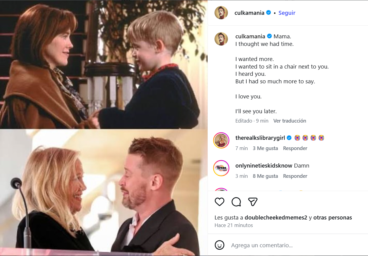 “Mamá. Pensé que teníamos tiempo. Quería más. Quería sentarme en una silla a tu lado. Te escuché pero tenía mucho más que decir. Te quiero. Nos vemos luego”, expresó Culkin en su cuenta de Instagram junto a dos fotos de él y Catherine: una en Mi pobre angelito y otra de un evento en Hollywood más cercano en el tiempo.