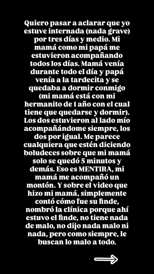 Allegra se mostró indignada con los ataques que recibió la modelo por un video que publicó recientemente: "Me parece cualquiera que estén diciendo boludeces sobre que mi mamá solo se quedó 5 minutos. Eso es MENTIRA. Sobre el video que hizo mamá, simplemente contó cómo fue su finde, nombró la clínica porque ahí estuvo, no tiene nada de malo".