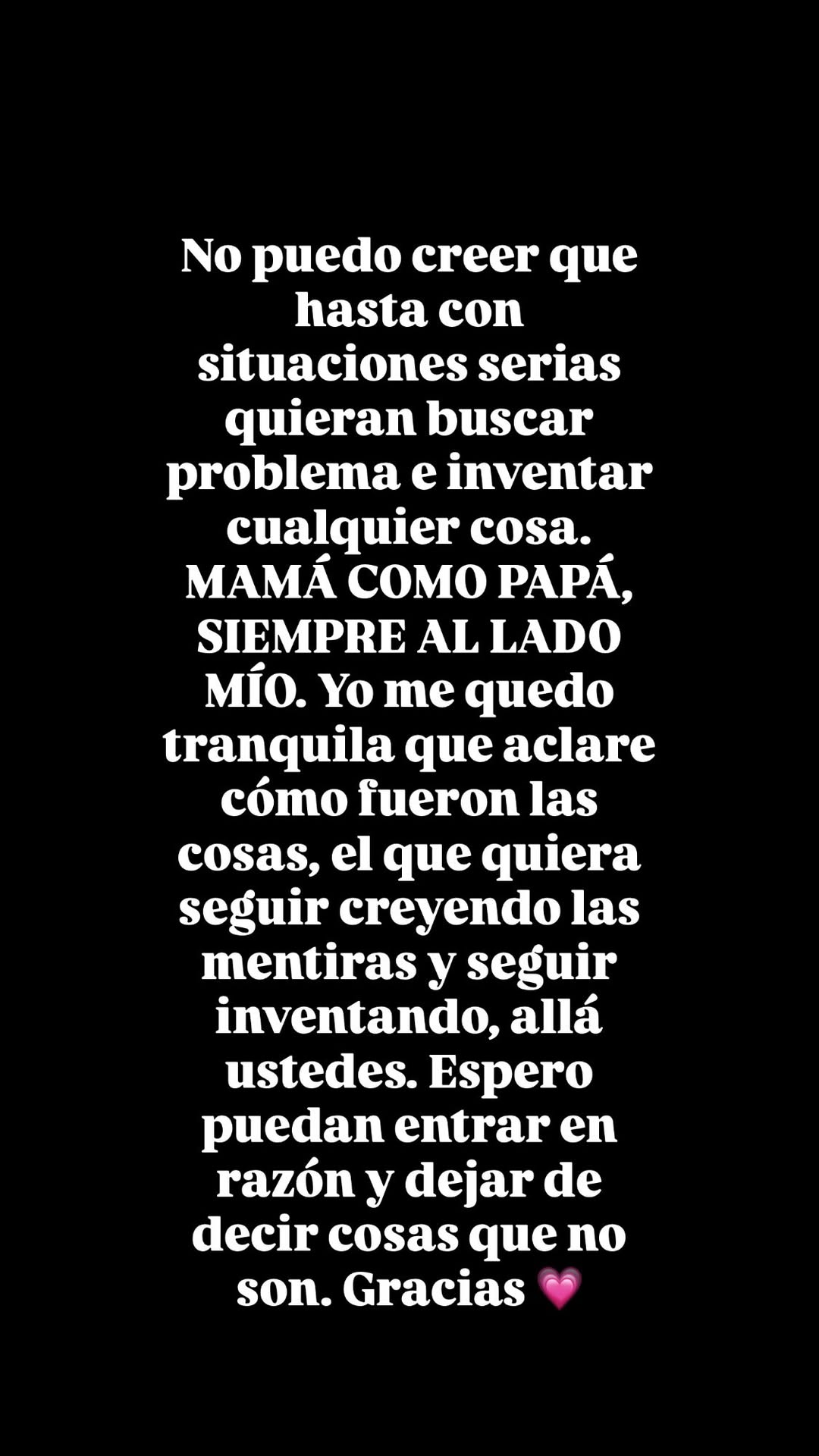 Con un tono firme, la hija del ex futbolista y la modelo cerró su mensaje pidiendo conciencia: "No puedo creer que hasta con situaciones serias quieran buscar problema e inventar cualquier cosa. MAMÁ COMO PAPÁ, SIEMPRE AL LADO MÍO. El que quiera seguir creyendo las mentiras, allá ustedes".