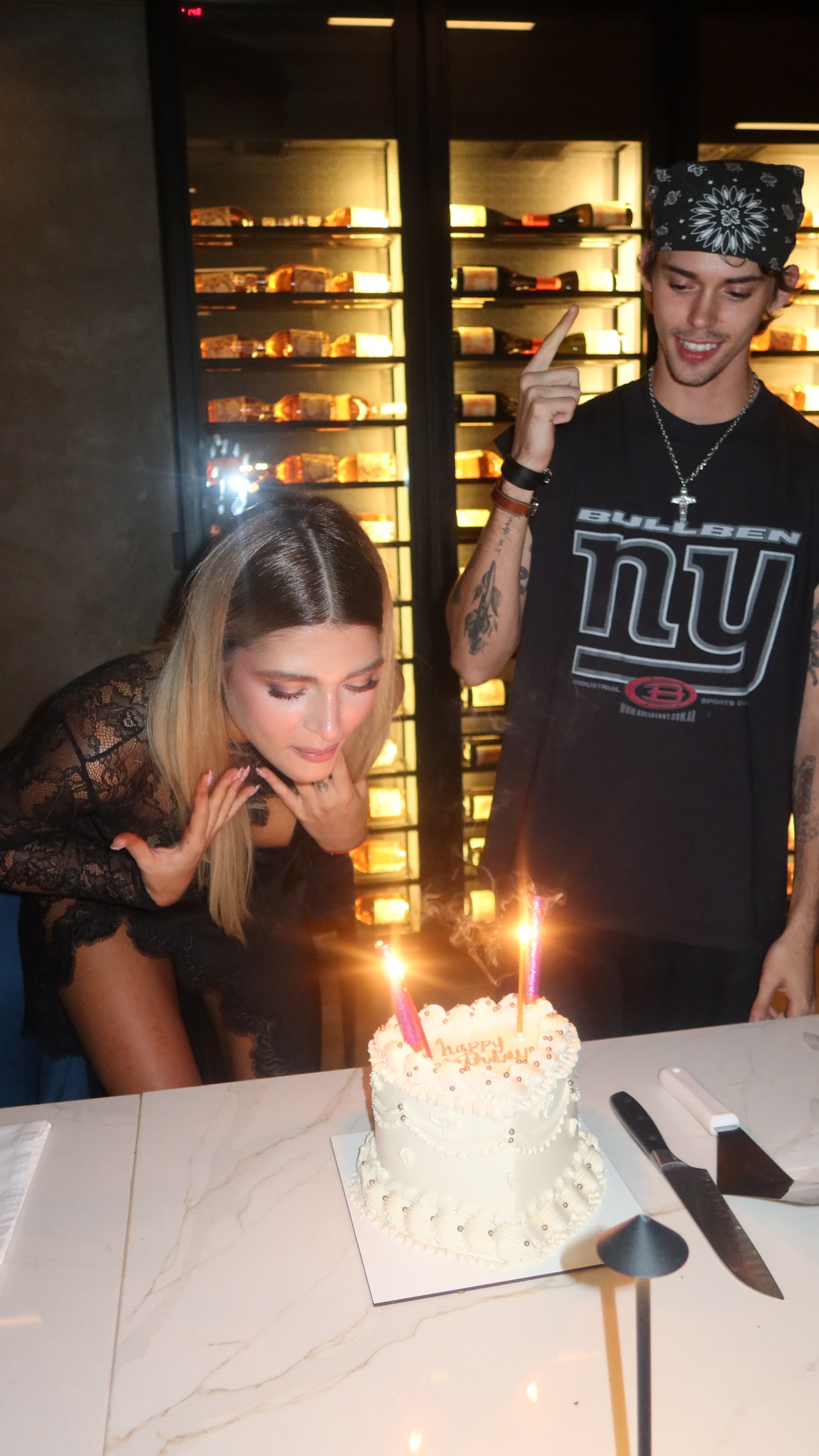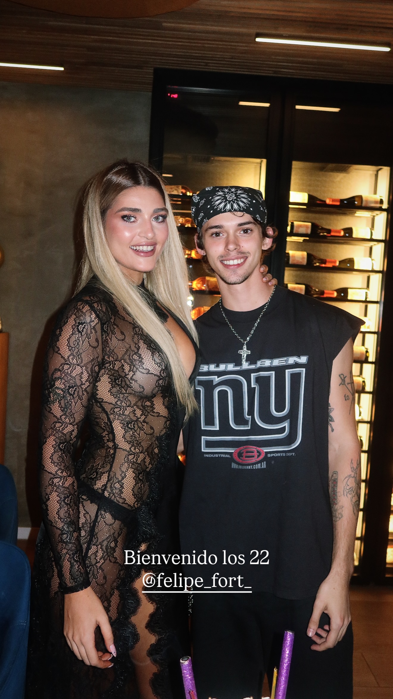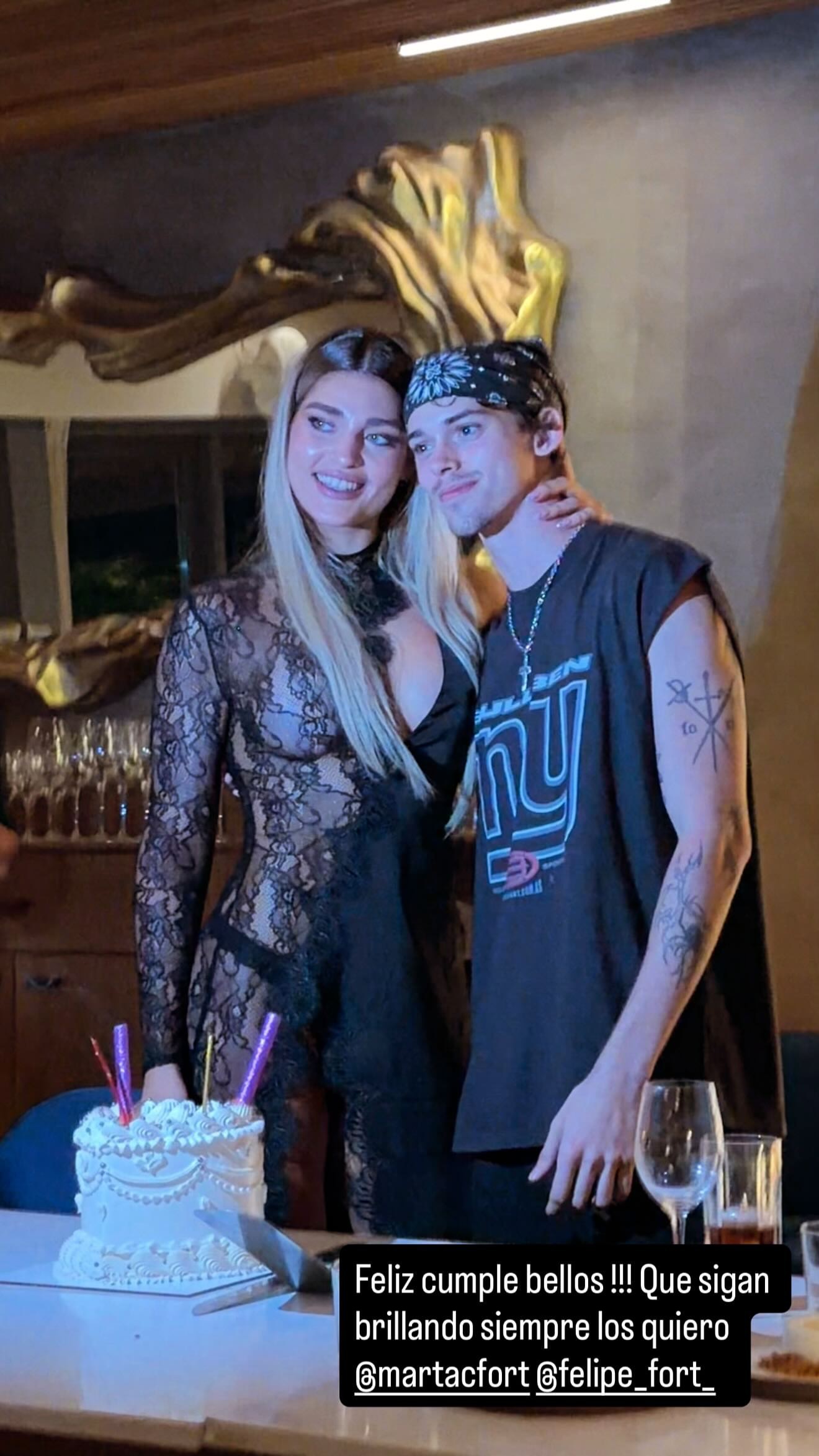 Fieles a su estilo, los cumpleañeros no descuidaron ni un detalle de sus outfits. Marta eligió un look "total black" de alto impacto: un mini vestido con transparencias y detalles de encaje que combinó con un estilismo natural de cabello suelto y ondas. Por su parte, Felipe apostó por la elegancia relajada, luciendo una camiseta blanca clásica, logrando look mega canchero.