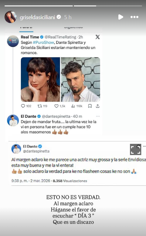 Griselda levantó el escrito del músico, lo replicó en sus historias de Instgram y escribió: "Esto no es verdad. Al margen, aclaro: háganse el favor de escuchar "DÍA 3" que es un discazo".