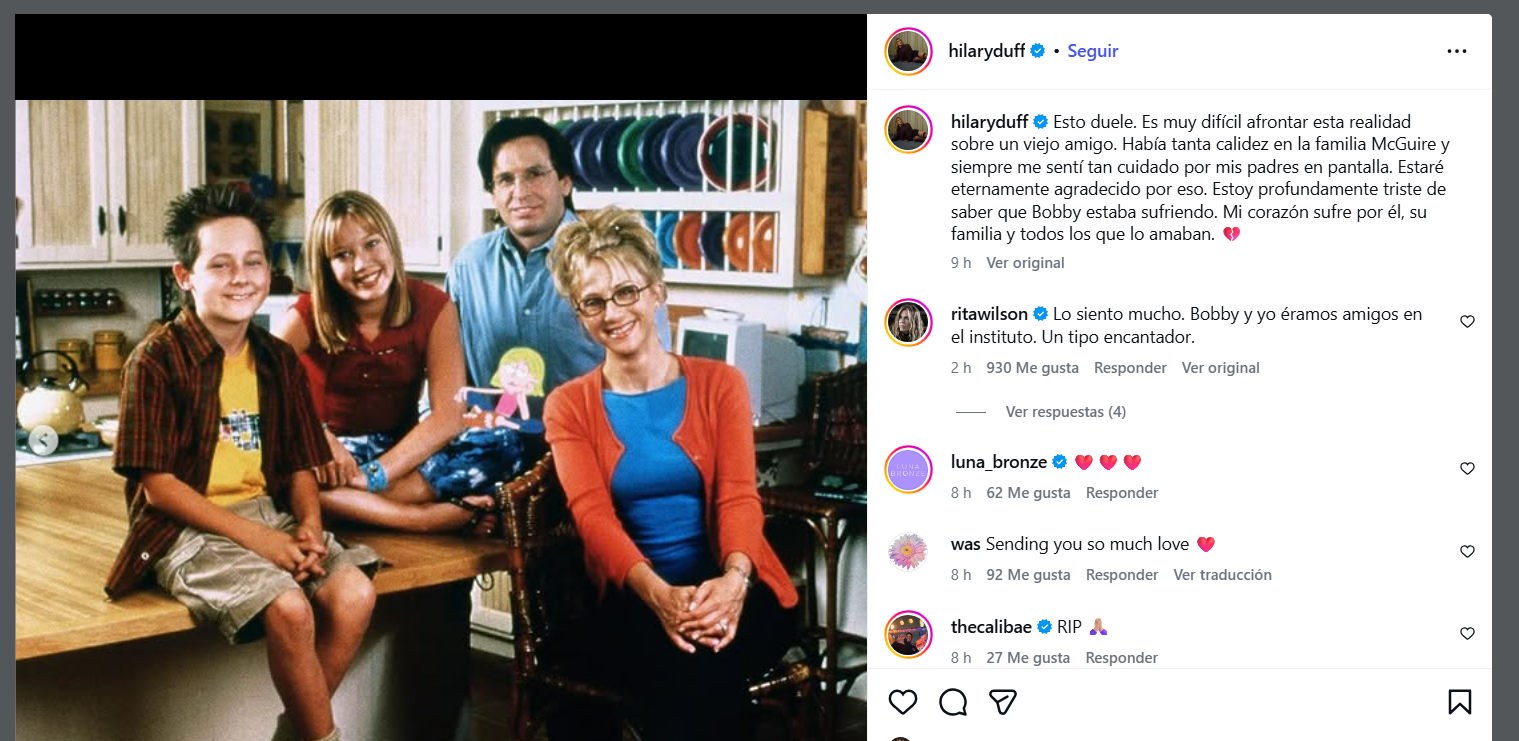 “Esto duele. Es muy difícil afrontar esta realidad sobre un viejo amigo. Había tanta calidez en la familia McGuire y siempre me sentí tan cuidado por mis padres en pantalla. Estaré eternamente agradecido por eso", comenzó la también cantante en sus redes sociales.