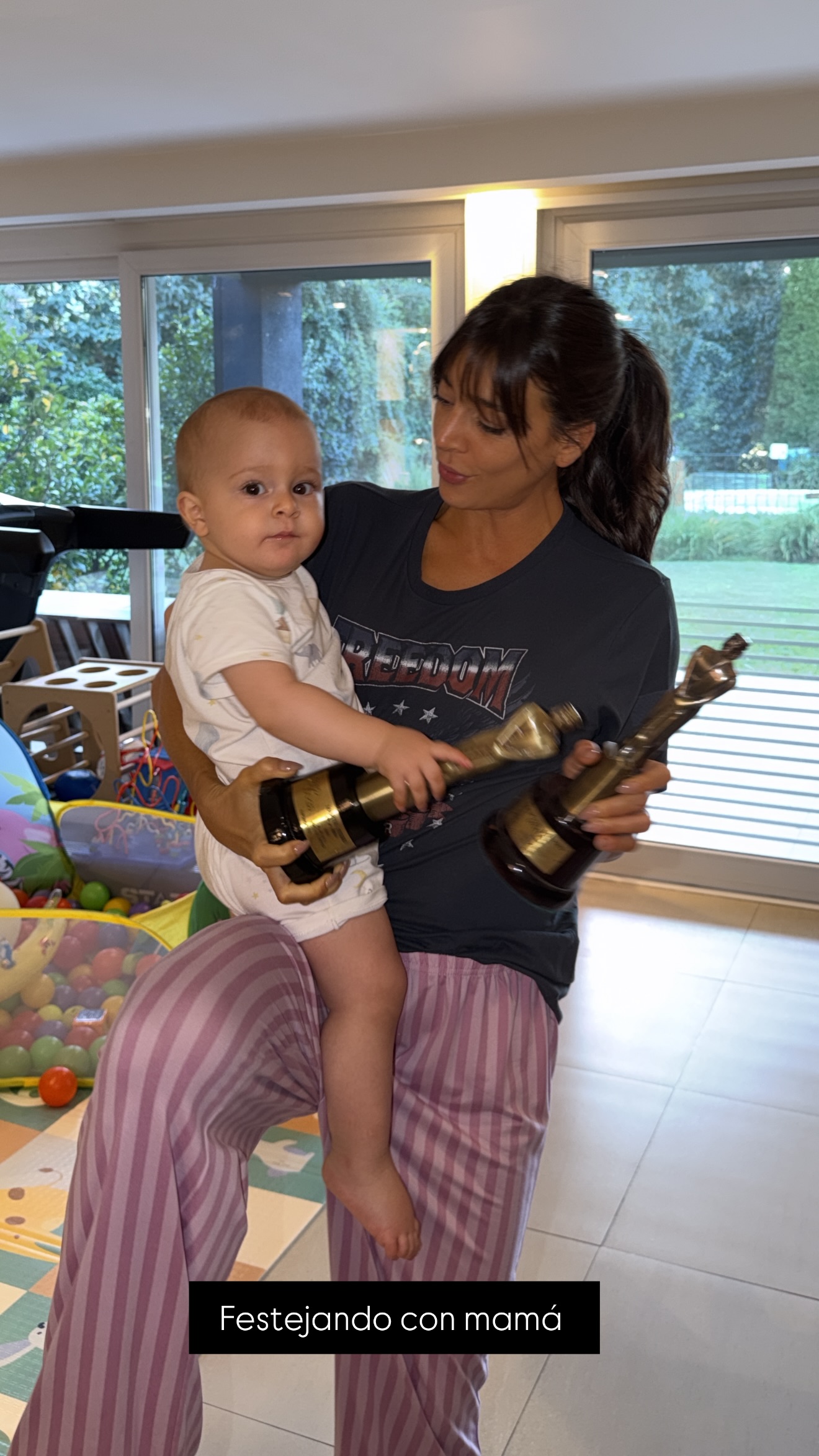 "Festejando con mamá", escribió junto a la foto donde el chiquitín también sostuvo el galardón dorado. Sin dudas, el mejor broche de oro para una noche inolvidable.