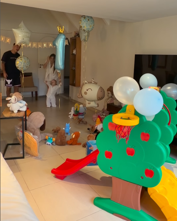 En la cuenta de Instagram de su hijo, la pareja compartió la tierna sorpresa que le hicieron para celebrar su primer año de vida. “Así me despertaron en mi cumple”, escribieron junto al video en el que se lo puede ver a Marco descubriendo que el living estaba lleno de muñecos, globos y un juego con un tobogán.