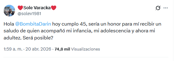“Hola @BombitaDarin hoy cumplo 45, sería un honor para mí recibir un saludo de quien acompañó mi infancia, mi adolescencia y ahora mi adultez. Será posible?”, escribió en concreto la mujer.