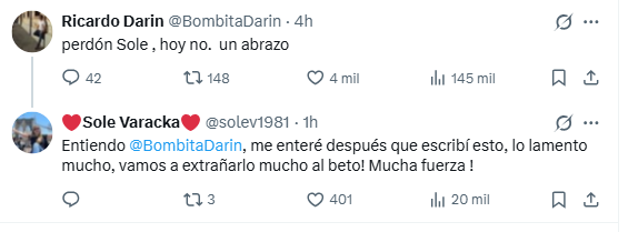 “Entiendo @BombitaDarin, me enteré después que escribí esto, lo lamento mucho, vamos a extrañarlo mucho al beto! Mucha fuerza !”, le devolvió ella.