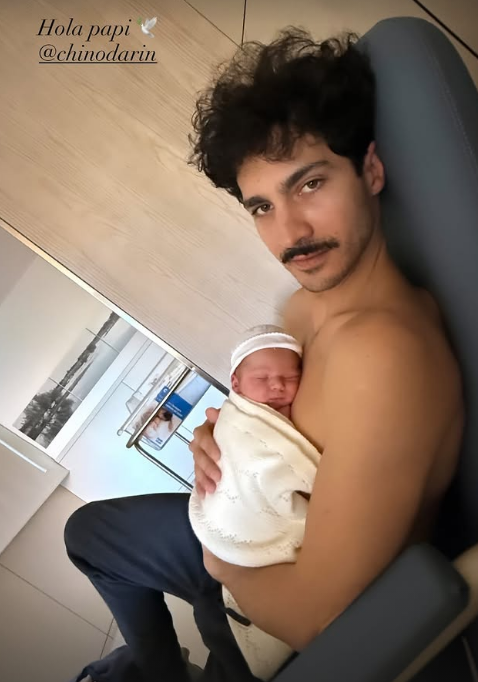 “Hola papi”, escribió la española en la postal compartida en Instagram Stories. En la fotografía se puede ver al actor argentino en cuero, recostado en el sillón de la sala de maternidad con el bebé en brazos.