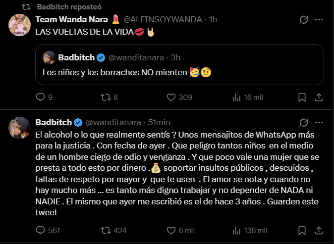 “¿El alcohol o lo que realmente sentís? Unos mensajitos de WhatsApp más para la Justicia. Con fecha de ayer. Qué peligro tantos niños en el medio de un hombre ciego de odio y venganza. Y que poco vale una mujer que se presta a todo esto por dinero”, disparó Wanda contra Icardi y Suárez.