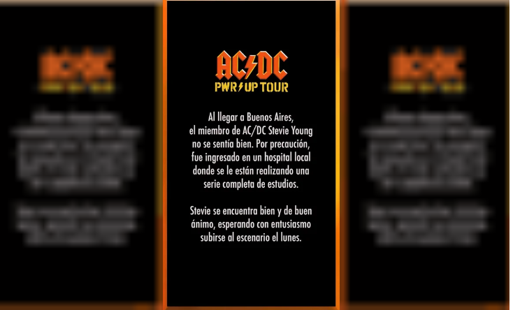 “Al llegar a Buenos Aires, el miembro de AC/DC Stevie Young no se sentía bien. Por precaución, fue ingresado en un hospital local donde se le están realizando una serie completa de estudios", informaron.
