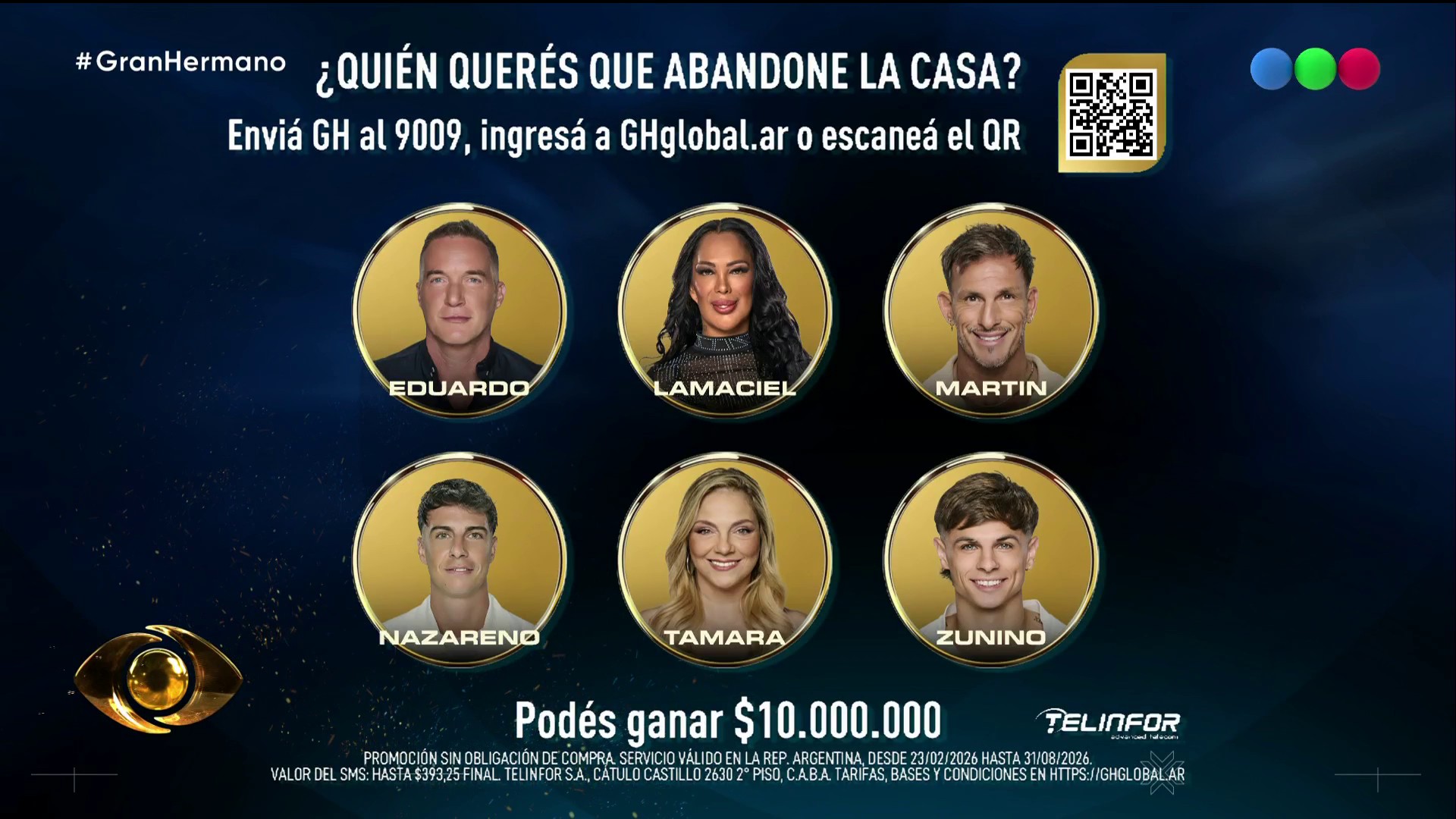 La placa negativa de la octava semana de competencia está conformada por Franco Zunino, Martín Rodríguez, La Maciel, Tamara Paganini, Nazareno Pompei y Eduardo Carrera. Uno de ellos se irá de la casa el lunes 20 de abril por decisión del público. Podés votar ingresando a GHGlobal, enviando GH al 9009 o escaneando el código QR que aparece en la pantalla de Telefe.