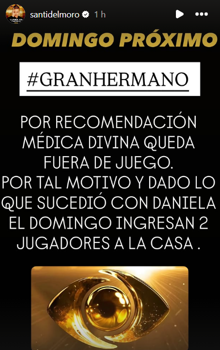 “Por recomendación médica, Divina Gloria queda fuera de juego”, informó el conductor de Gran Hermano Generación Dorada a través de las redes sociales.