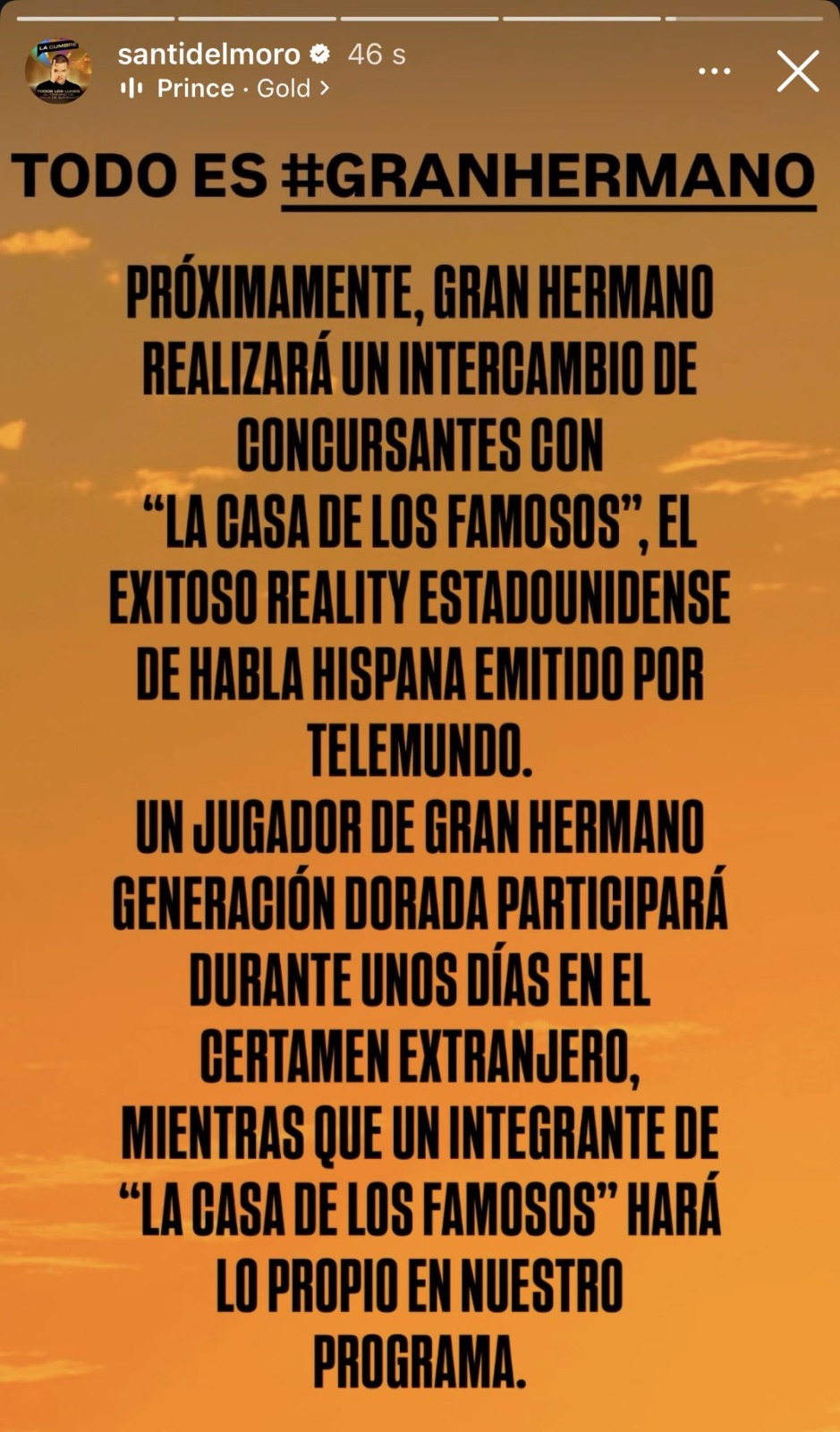 “Próximamente, Gran Hermano 2026 realizará un intercambio de concursantes con La casa de los Famosos, el exitoso reality estadounidense de habla hispana emitido por Telemundo”, informó Santi en Instagram.