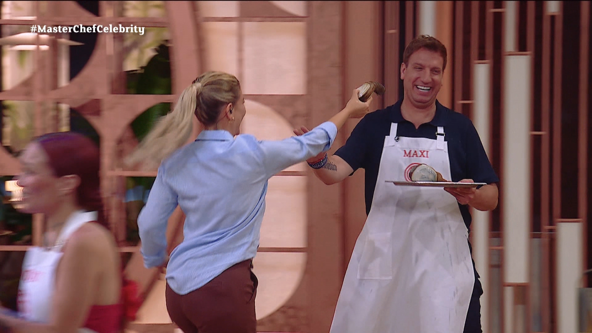Cuando descubrieron que la consigna de la noche era cocinar almeja panopea y que debían agarrarlas de la pecera, Maxi encaró a Wanda: “¡Tomatelá! Te apuesto una cena si la agarrás vos, donde quieras”. Entonces, la conductora se animó a agarrarle las dos almejas que luego cocinaría, pero antes de dejarlas en la bandeja chicaneó a Maxi corriéndolo.