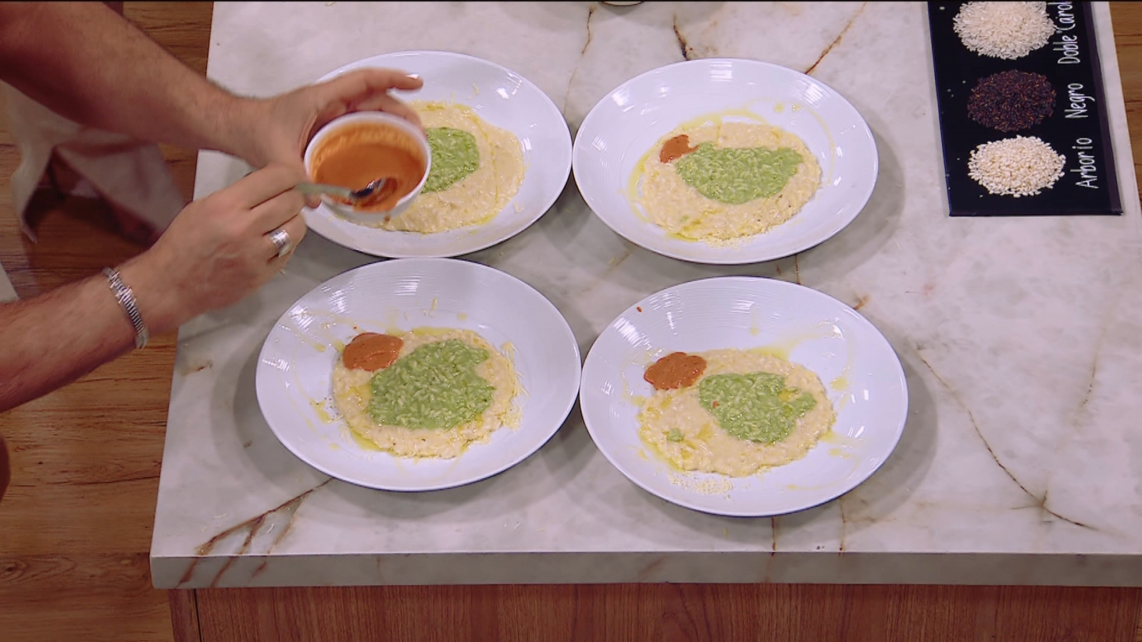 Donato hizo movimientos impactantes para la mantecatura del risotto, y coronó su arroz con un corazón de puré de espinaca y morrones.