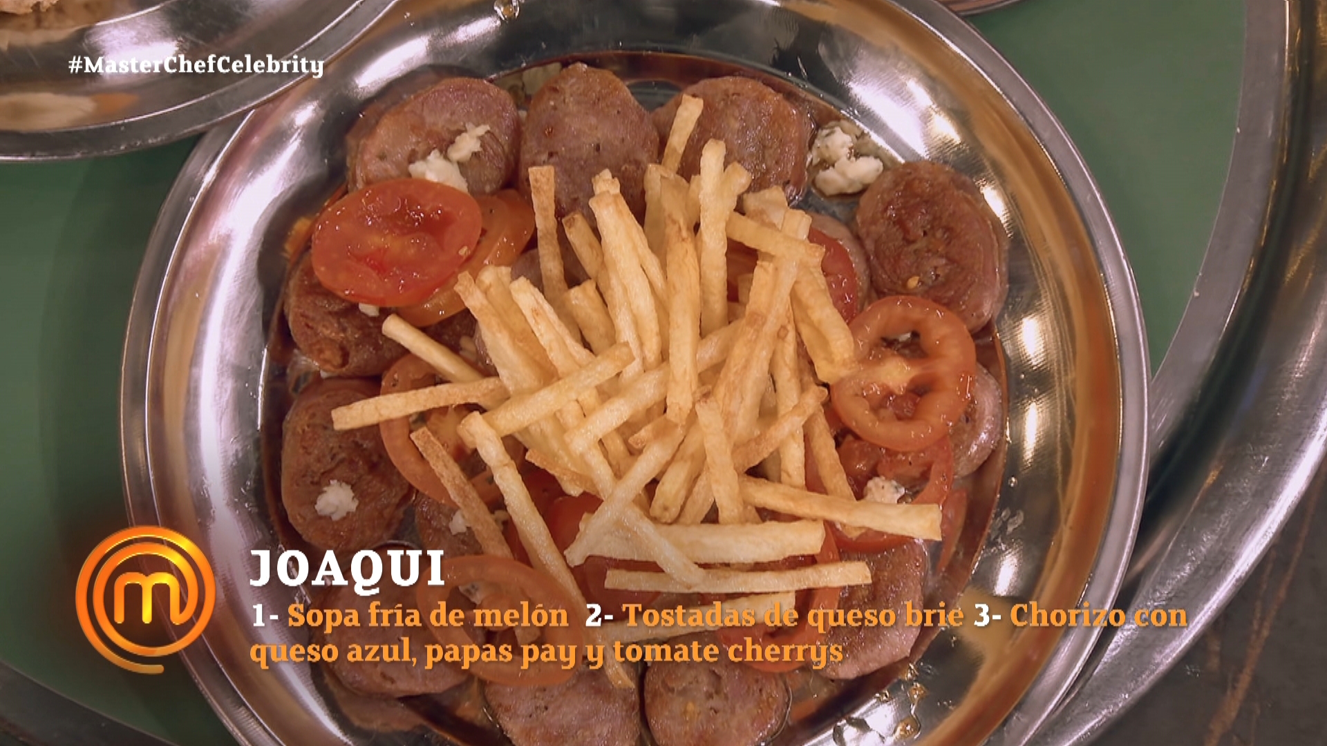 En segundo lugar pasó La Joaqui con sopa de melón, tostadas de queso brie y un plato de queso azul, papas pay y tomates cherrys. “Yo sé que están hartos de mis sopas frías, pero si es mi restaurante, tiene que haber. El lugar se va a llamar Vino y Princesas”, informó la cantante de RKT.